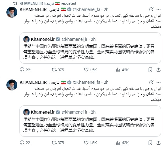 روند تولید: حساب توییتر دفتر رهبر انقلاب در شبکه ایکس با انتشار توییتی به دو زبان فارسی و چینی، از ضرورت تقویت و همگرایی ایران و چین برای حل مسائل منطقه‌ای و جهانی نوشت.